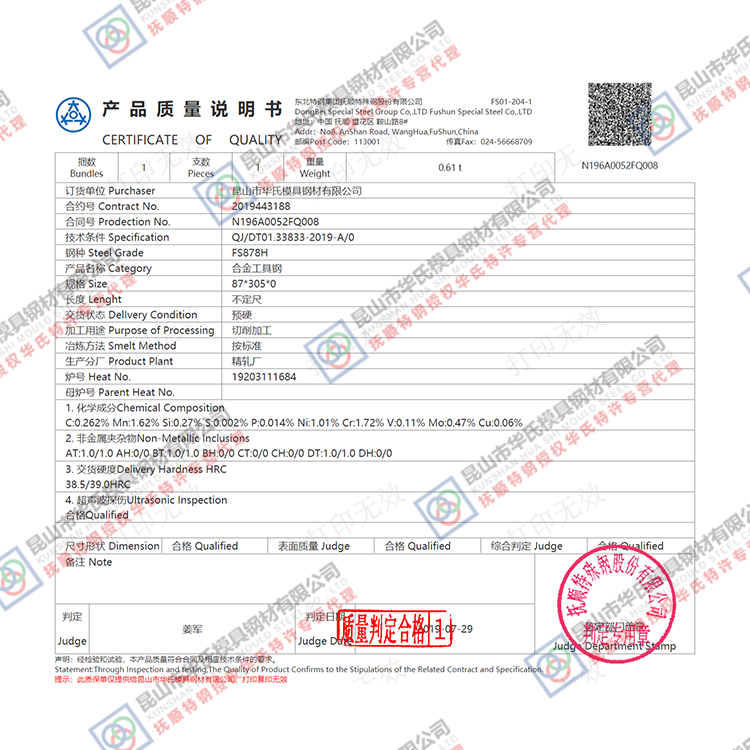我司是华东地区唯一一家专营抚顺特钢产品的模具钢材公司,近期发现在百度及阿里巴巴平台上打着某某地区销售分公司和代理商等旗号,误导广大客户,由于我司是专营抚顺特钢,无代理销售其他钢厂产品,避免出现某些经销商以低于出厂价销售,却是以次充好,挂羊头卖狗肉的情况发生。我司可以开规格料和精板加工,更好的服务广大客户,减少客户的备货资金压力。用多少买多少才是最好的。欢迎前来咨询及洽谈!